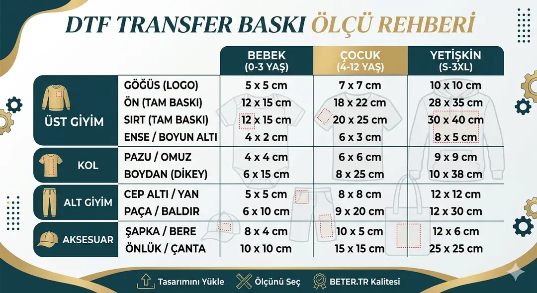 "Not: Bu ölçüler tekstil endüstrisinde kullanılan standart referans değerleridir. Tasarımınızın formuna (yuvarlak, kare, dikey) göre en uygun yerleşim profesyonel ekibimiz tarafından optimize edilecektir."